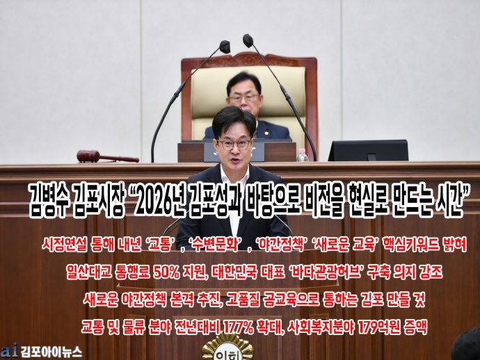 ±è ½ÃÀåÀº À̳¯ 2026³âµµ ù¹øÂ° ½ÃÁ¤ Ű¿öµå·Î ¡ã±³ÅëÀ¸·Î ÅëÇÏ´Â ±èÆ÷ ¿Ï¼ºÀ» ¾ð±ÞÇß´Ù. ±×´Â ¼¿ï5È£¼±, GTX-D, ÀÎõ2È£¼±, ¼¿ï2·9È£¼± ±èÆ÷¿¬Àå±îÁö ±èÆ÷ÀÇ ¹Ì·¡¸¦ ¹Ù²Ü ±¤¿ª±³Åë¸Á ±¸Ãà »ç¾÷À» Â÷Áú¾øÀÌ ÃßÁøÇÏ´Â ÇÑÆí, ±èÆ÷°ñµå¶óÀÎ Àüµ¿Â÷ ÁõÂ÷ Çѽà Áö¿øÀ» À§ÇÑ 45¾ï¿øÀÇ ¿¹»êÀ» Æí¼ºÇØ ¹èÂ÷°£°Ý 2ºÐ 10Ãʸ¦ ¿Ï¼ºÇÏ°Ú´Ù°í ¹àÇû´Ù. ¶ÇÇÑ ÀÏ»ê´ë±³ ÅëÇà·á 50% Áö¿ø¿¡ ´ëÇÑ Á¶·Ê¸¦ Á¦Á¤Çϰí, ³»³â »ó¹Ý±â ÀÏ»ê´ë±³(ÁÖ)¿Í ½Ã½ºÅÛÀ» ±¸ÃàÇØ ÇϷ绡¸® Áö¿øÀÌ ÀÌ·ïÁú ¼ö ÀÖµµ·Ï ÃÖ¼±À» ´ÙÇϰڴٰí ÀüÇß´Ù.