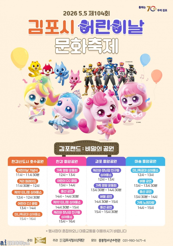 ¿À´Â 5¿ù 5ÀÏ, ±èÆ÷ Àü¿ªÀÌ ÇϳªÀÇ °Å´ëÇÑ ³îÀ̰ø¿øÀÌ µÈ´Ù. ±èÆ÷½Ã´Â ½Ã°¡ ÁÖÃÖÇÏ°í ±èÆ÷½Ãû¼Ò³âÀç´Ü¿¡¼ ÁÖ°üÇÏ´Â Á¦104ȸ ¾î¸°À̳¯ ¹®ÈÃàÁ¦°¡ ÇѰ½Åµµ½ÃÈ£¼ö°ø¿ø(¸¶»êµ¿), ÇѰÁß¾Ó°ø¿ø(Àå±âµ¿), °ÉÆ÷Áß¾Ó°ø¿ø(°ÉÆ÷µ¿), ¸¶¼ÛÁß¾Ó°ø¿ø(ÅëÁøÀ¾)¿¡¼ µ¿½Ã °³Ãֵȴٰí 20ÀÏ ¹àÇû´Ù.